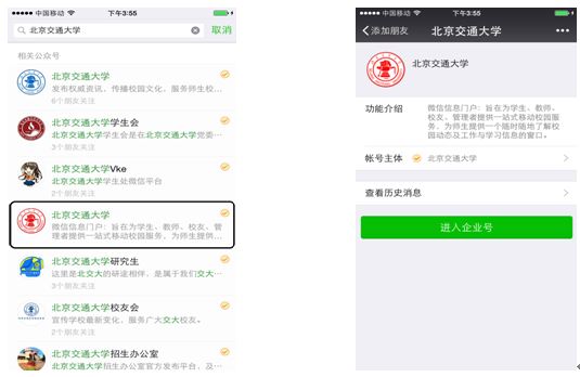 1.  微信右上角添加朋友,然后选择查找“公众号”,输入“北京交通大学”后搜索,选择红色校徽的北京交通大学,点击后关注。